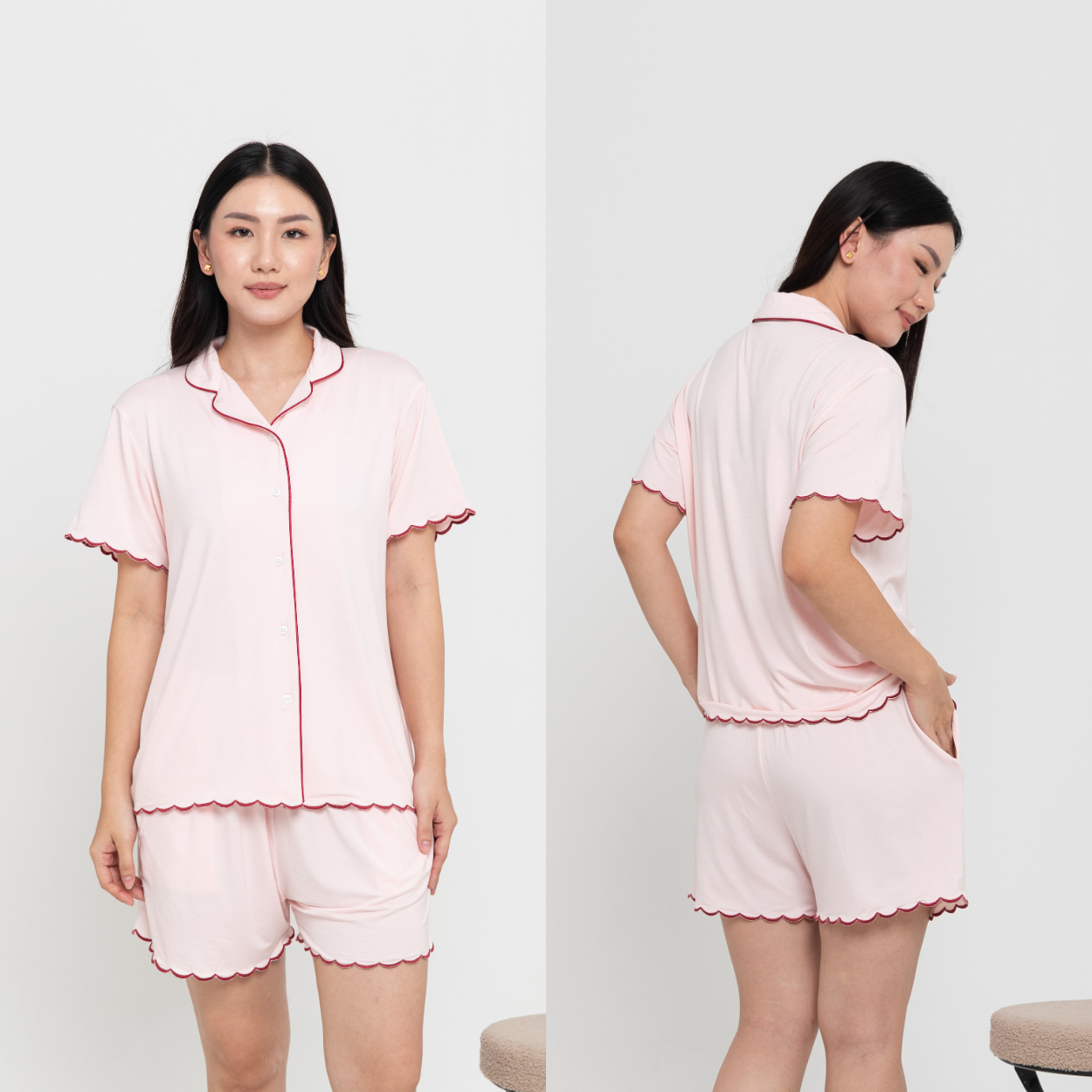 Our signature women’s short-sleeve pyjamas, now elevated with a charming red scallop trim. Designed in our ultra-soft bamboo blend for breathable comfort, with a relaxed fit, stretchy waistband, and pockets on both sides. Pregnant and nursing-friendly for easy, all-day wear.