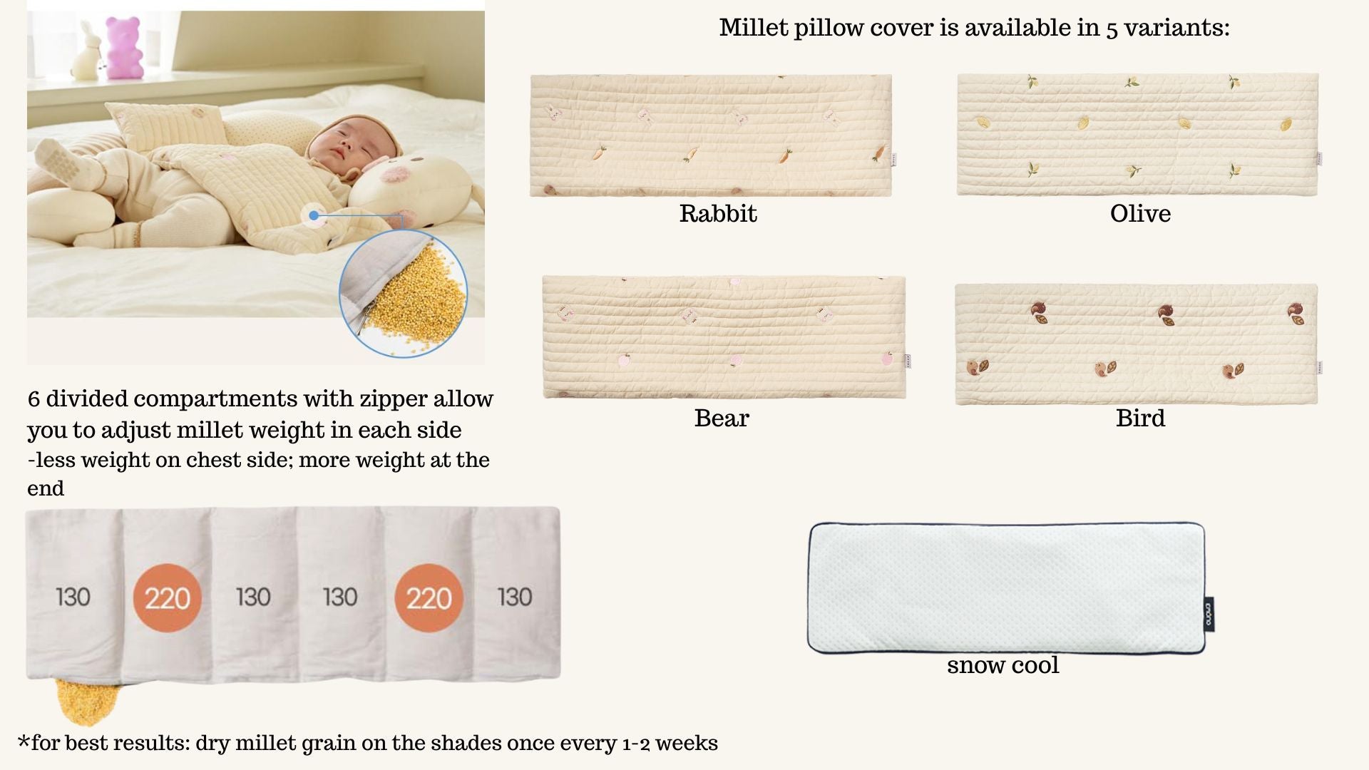 - In ancient Korea, millet (grain) was utilized in Eastern medicinal manuals by our ancestors due to its remarkable cooling properties, known for effectively reducing fever. The inclusion of millet in our product ensures a cooling effect that can also help soothe baby fever.