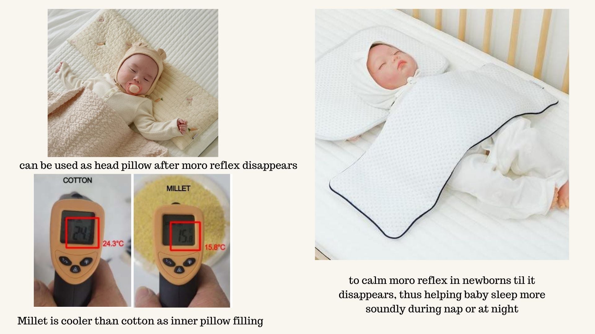 - Emong Millet Pillow: is filled with 100% natural millet (0 chemicals) and casings made of soft, cozy fabrics that are gentle on a baby's delicate skin. It has 6 compartments and the amount of millet on each one can be adjusted accordingly to your needs. More weight is put on the end sides to make sure it doesn't roll off easily like conventional pillow.