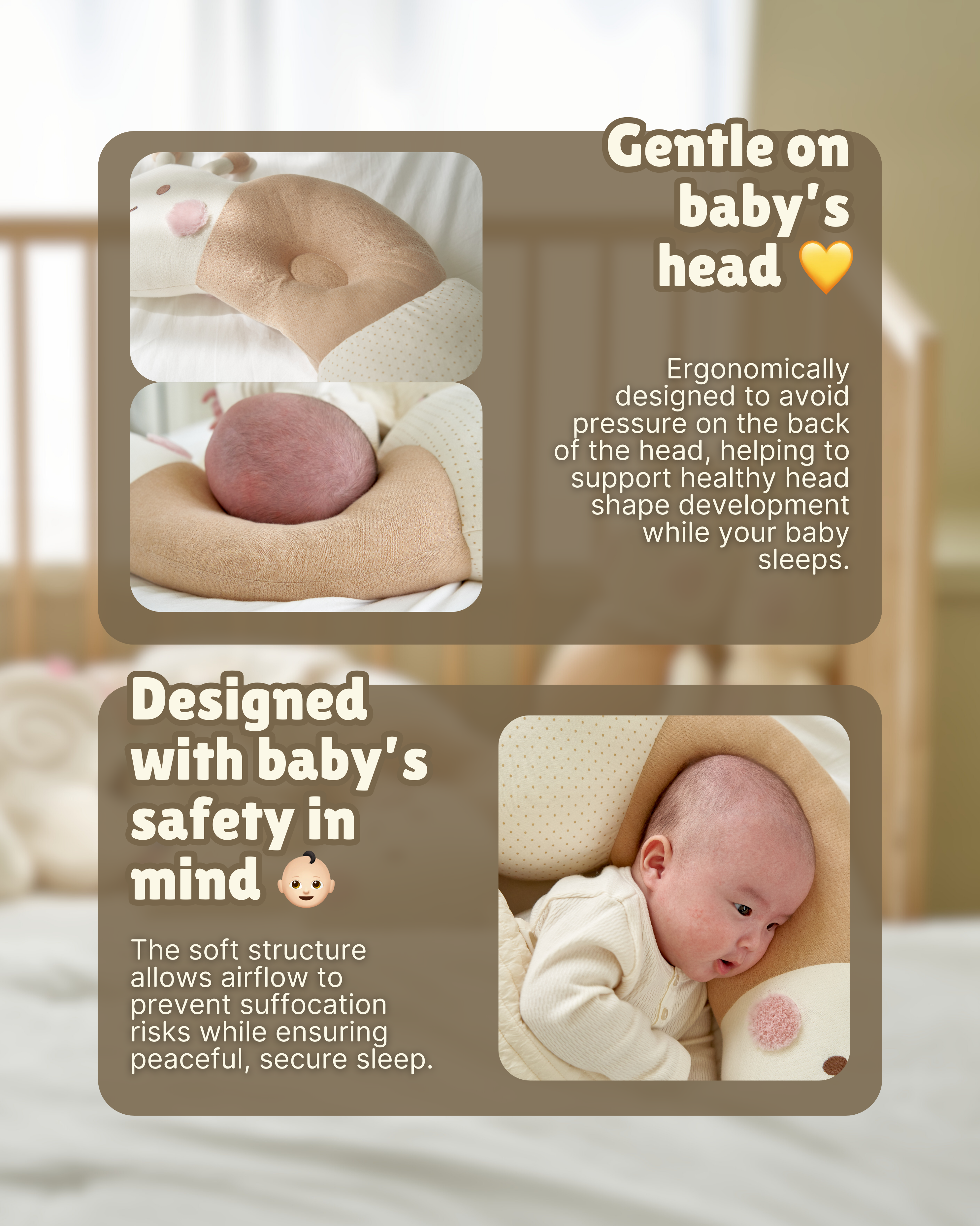 Its unique shape and good support help prevent flat head, making it a must-have for your baby's healthy development.