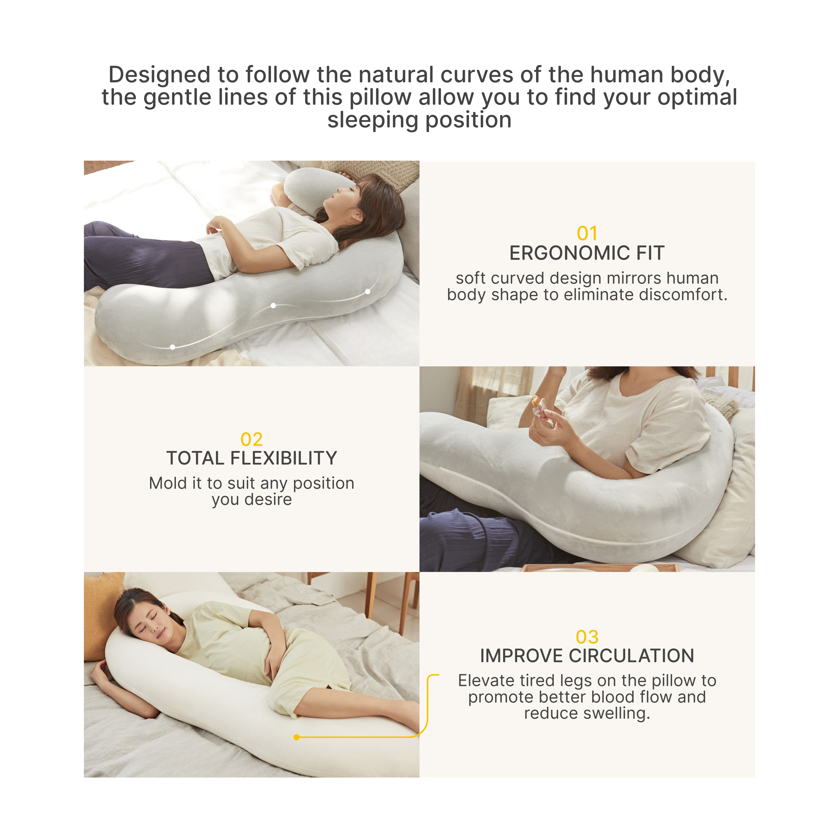 - Ergonomic 3-section design that supports the head, belly, back, hips, and legs
