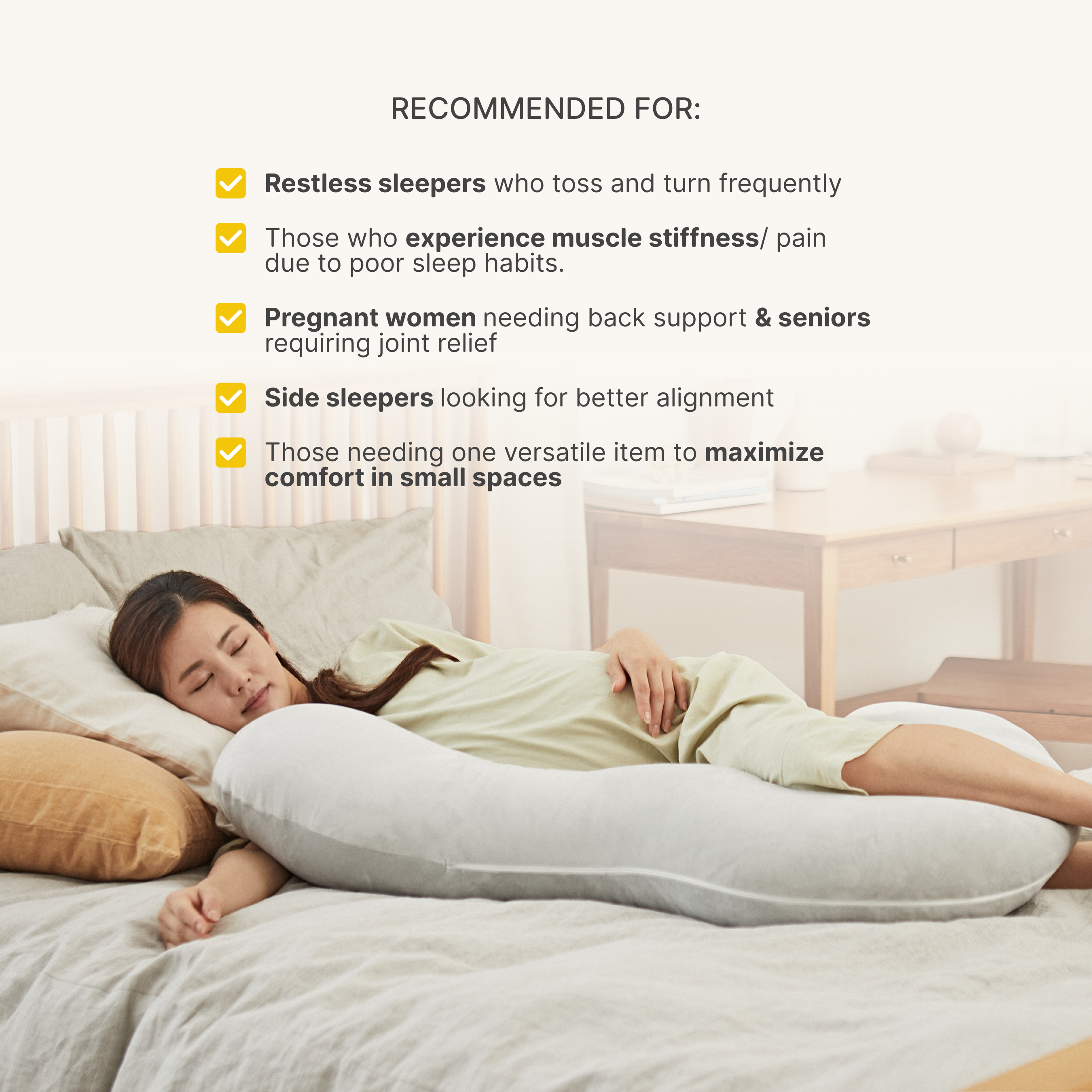 Designed gently to follow the natural curves of the human body, Emong Maternity Pillow provides full-body support for expecting moms - helping you rest, relax, and sleep more comfortably through every stage of pregnancy.